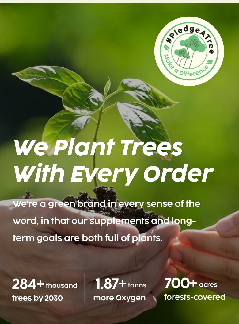 We're a green brand in every sense of the word, with our supplements and personal care products made from plant-based ingredients. Our long-term goals are centered around environmental consciousness and sustainability, which guide us every day to make choices that benefit the planet. With your help and support, we're getting close to our goal of planting 1 million trees by 2024, contributing to a greener future for all.